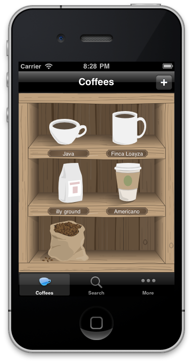 The cupboard is the first screen you see when opening the App. Its here, that you’ll collect all of your coffees. This screenshot also shows each of the five icons that you can choose from to represent a coffee in your cupboard (I plan on adding to, and improving, these icons). What isn’t obvious from the screenshot is that the cupboard can be scrolled vertically by dragging your finger, thus you can have as many coffees as you want.