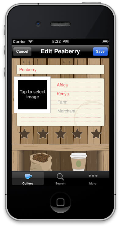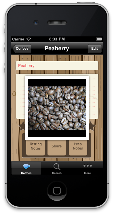 This screen is one of the more visually interesting screens since it incorporates stars for rating the coffee as well as a polaroid styled image. The image used for the polaroid is set in the edit screen (either via your built-in-camera or photo library). Tapping the polaroid expands it (as shown below).