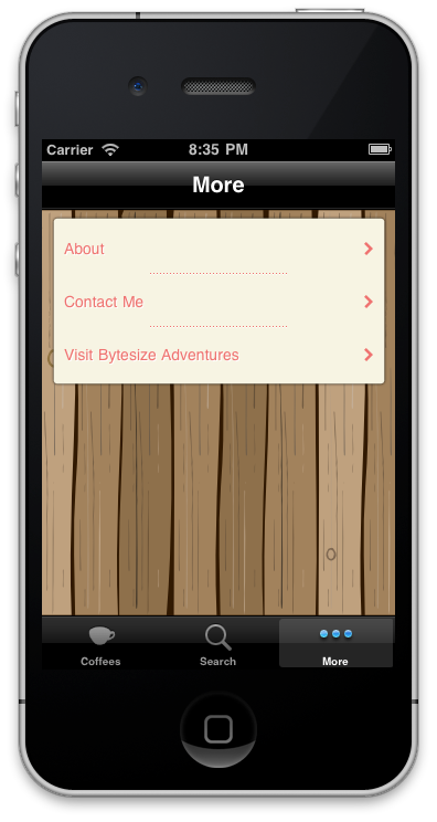 The more screen is simply a list of miscellaneous actions. A screen containing information about the App, an option to send me a support email, and a link to my website.