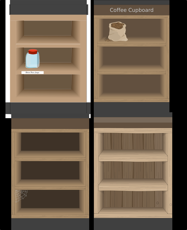 In the image above you can see how the cupboard screen evolved. There were many more iterations than shown here but these are some of the more interesting ones. From the early placeholder graphics through something with a little more form, onto the cobweb stage (hmmm not quite hitting the right note) and at last the final version.