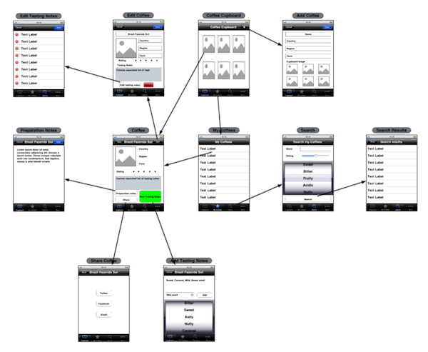 Part 1 - Doing it properly Part 2 - The Design Document Part 3 - The Wireframes (You are here) Part 4 - The Artwork Part 5a -The Code (Xcode, GIT, and Core Data) Part 5b - The Code (Coffee sharing and Camera functionality) Part 5c - The Code (A change in workflow) Part 6 - The testing Part 7 - The Final Artwork Part 8 - The Marketing Part 9 - The Launch Part 10 - The Numbers Part 11 - The Postmortem (Bonus) Part 12 - A review of the process