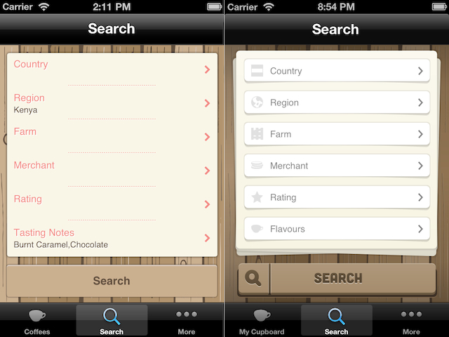 My goal with the view coffee screen was to improve the wood grain and create a more modern look. The background now benefits from better shading and grain. The text buttons are replaced with more substantial icon-driven buttons. The star ratings are more of a feature, easier to tap and look much better.