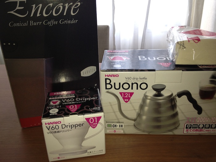 Here’s all of the fancy, and rather pricey, Japanese coffee equipment you’ve afforded me!