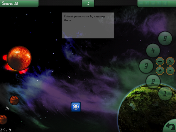 Here’s an example of a hint in Astro Noughts (These are a work in progress). It shows the hint that appears when a power-up appears on screen but doesn’t get collected. I’ve intentionally kept them fairly unobtrusive but you could of course make them flashy.