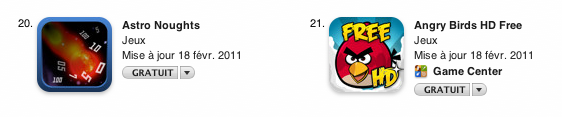 - For a brief period, Astro Noughts was higher than Angry Birds HD Free in the Top Free Apps in France.