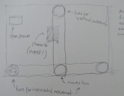 Pitch: You control a puppet by manipulating wheels to move along the x and y-axis. You’re given an item to create and must do so by moving your puppet to boxes (on the wall behind you) and selecting the correct combinations of materials. This is essentially a memory game. For the graphics, imagine old bookshops, wooden toys, and mysterious odds and ends.
