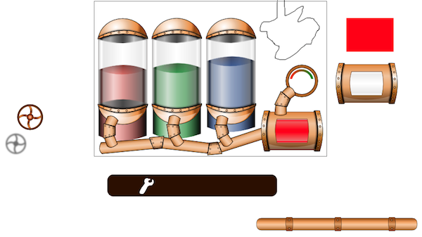 Pitch: The idea behind Colour Mix (the working title) was to create a colour matching game with a steampunk theme. Three vats of liquid represent the base colours, red, green, and blue. You turn the wheels on the vats to alter the mix, flick a lever, and see how close your colour is to the colour you have to match. Time limits and power-ups were going to be added to keep things interesting and, to add complexity, you would be required to fix the machine using various tools as and when it broke down.