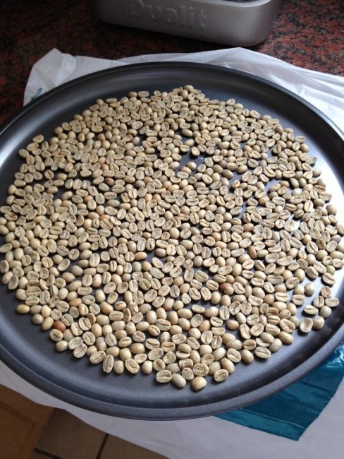 The first thing I did was to weigh out the coffee beans. The book says 150 grams which I found to be about a small coffee cup full. I then spread these out on the tray in a single layer.