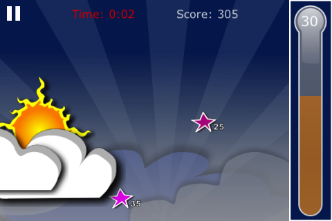 Star Fusion is a simple arcade game in which you control the Sun by dragging it along the y-axis. Stars move towards you from the right of the screen at varying speeds. In addition to the Sun you also control a thermometer which has a numeric heat value attached to it. Each of the stars also have a numeric value attached to them. Your aim is to collect the stars by matching the value of the thermometer with the numeric value of the star at the moment it touches the Sun.